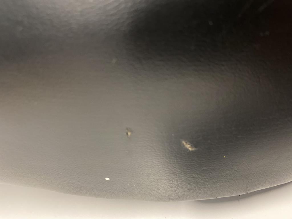 Está bastante bien, con su forma original, tiene dos o tres agujeros pequeños, base metálica original