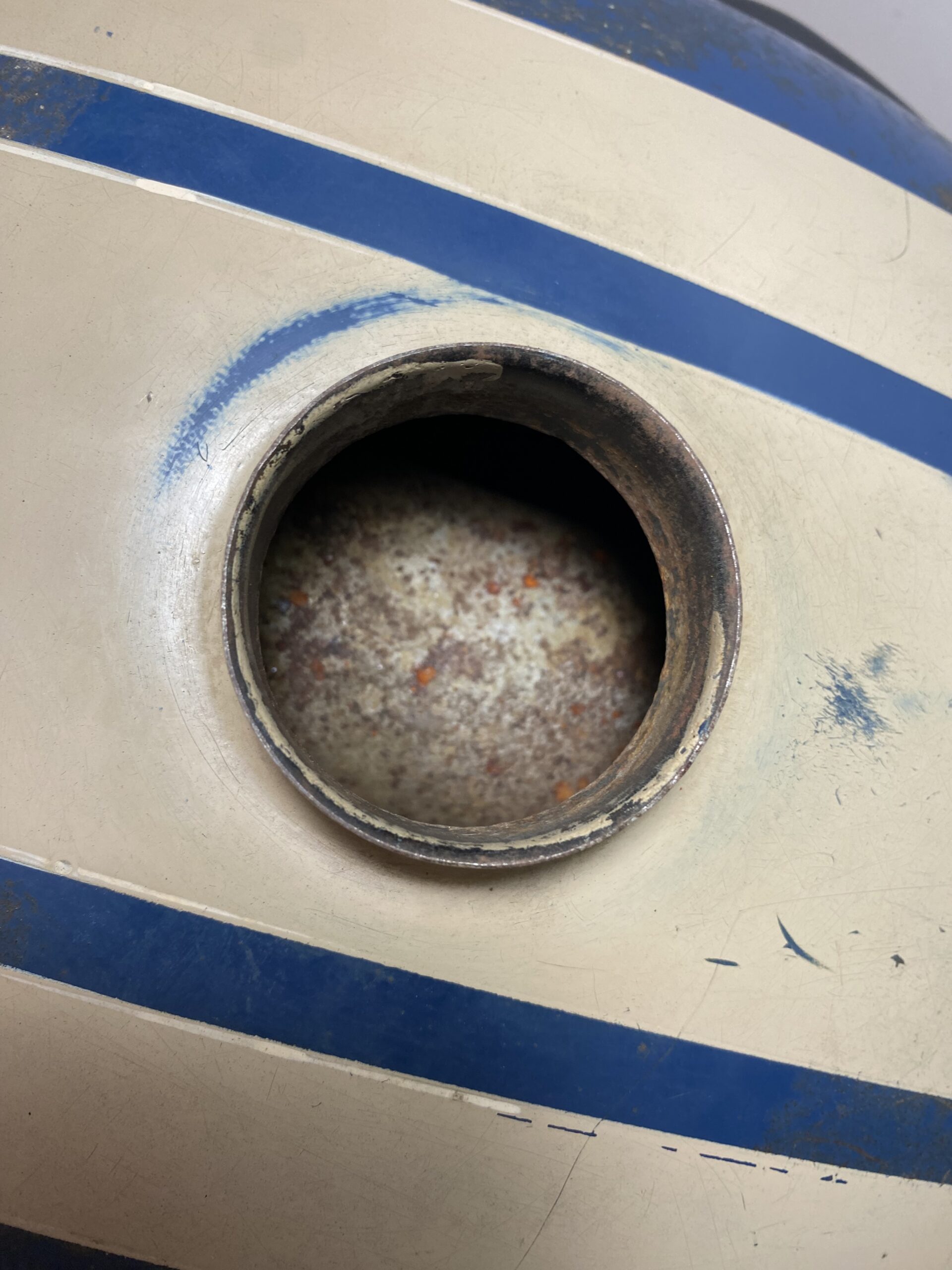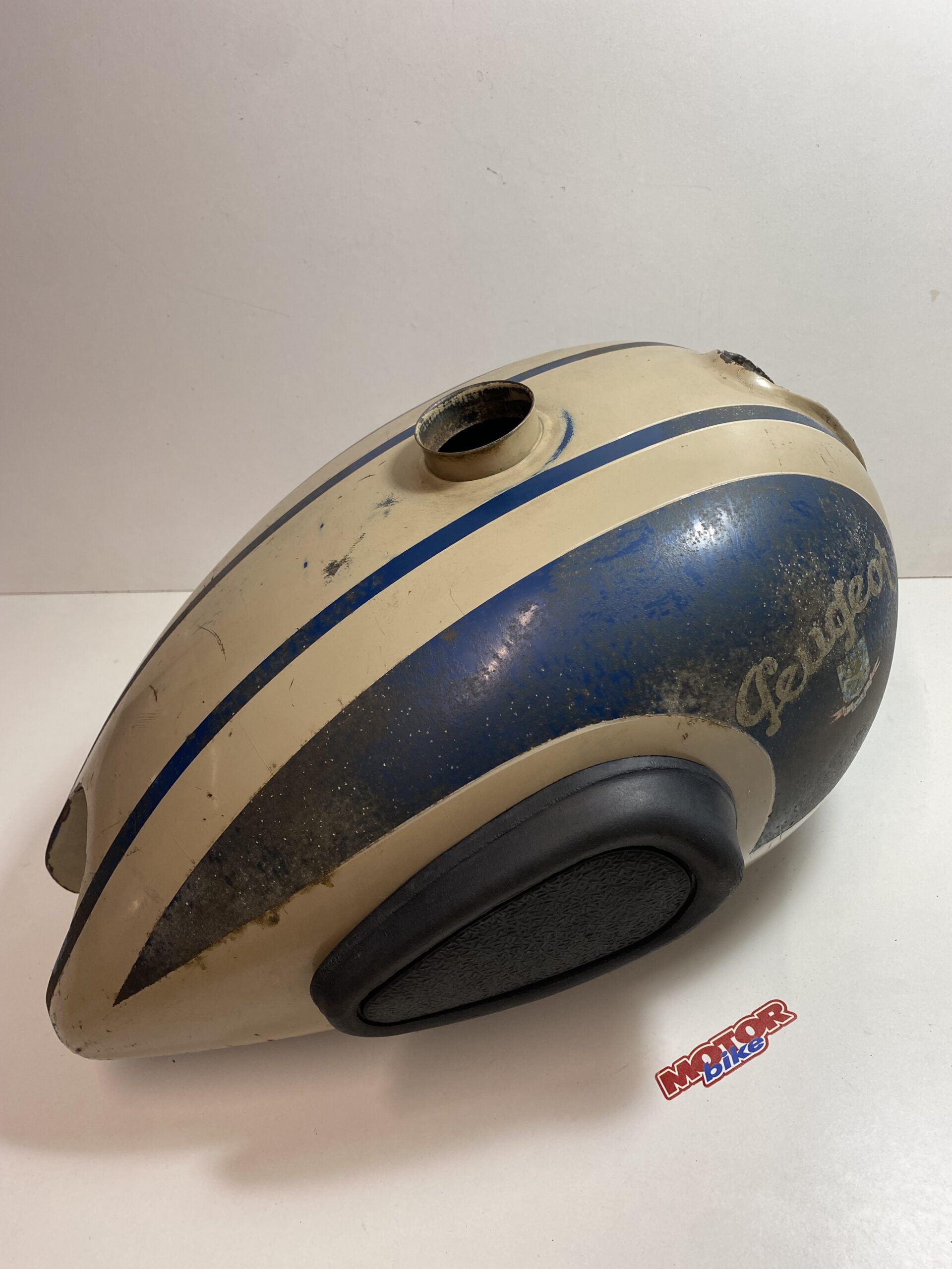 Depósito de gasolina para moto antigua Peugeot 125 años 50, con pintura original, tiene las gomas de las cachas laterales nuevas.